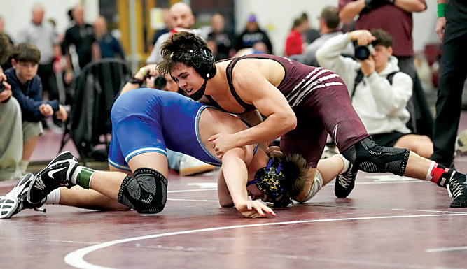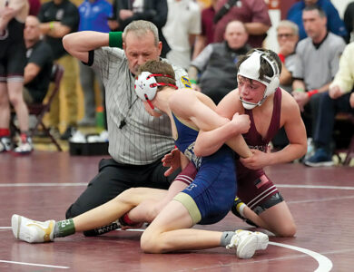 The Mountain Lions’ shot at winning the title was hampered by a broken rib by returning district runner-up Dominic Nardozza at 114. Nardozza won by technical fall in the quarterfinals and then had to forfeit his remaining bouts.