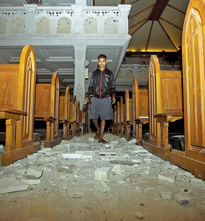 A man walks inside a cathedral where debris has fallen after an earthquake in Bali, Indonesia, on Sunday. A strong earthquake struck the Indonesian tourist island of Lombok on Sunday, killing at least 82 people and shaking neighboring Bali, one week after another quake on Lombok killed more than a dozen people. The Associated Press