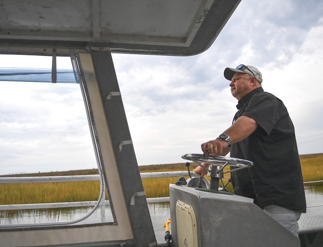 The Associated Press / Larry Laird pilots a boat with media members for a tour in Fox Island, Va. Chesapeake Bay Foundation’s Fox Island Environmental Education Program will be closing for good due to rising sea levels and erosion of the protective marshes surrounding the center.