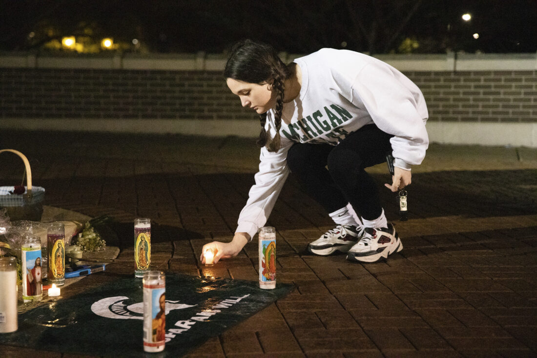 The Flint Journal via AP Maddie Kimball, a junior at Michigan State University from Spring Lake, Mich., lights a vigil candle at the Spartan Statue the night after a mass shooting on campus, in East Lansing, on Tuesday.
