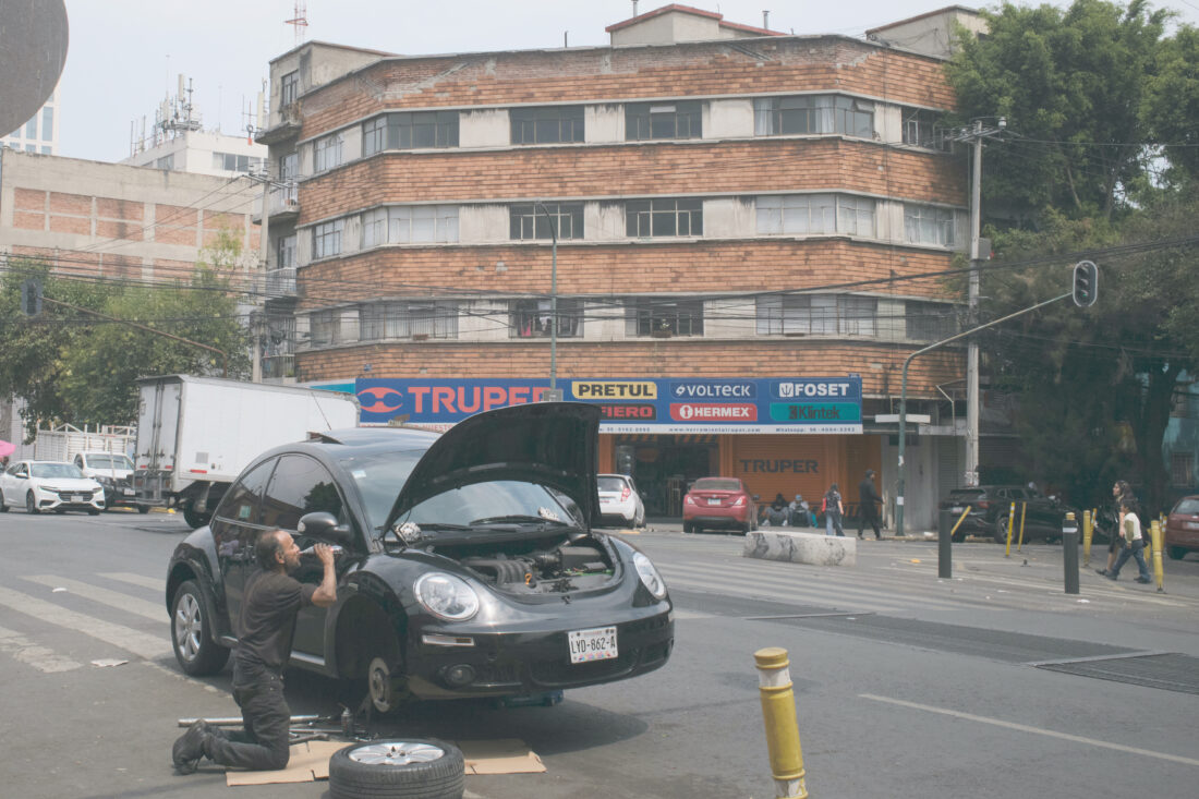 A mechanic repairing a car takes a break to drink soda in the Doctores neighborhood of Mexico City, Thursday, March 5, 2026. (AP Photo/Jon Orbach)