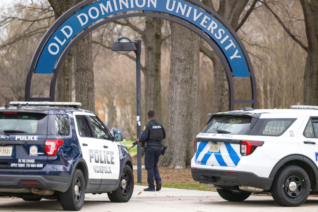 FILE - Police arrive outside Old Dominion University's campus after reports of an active shooter on March 12, 2026 in Norfolk, Va. (Kendall Warner/The Virginian-Pilot via AP, File)