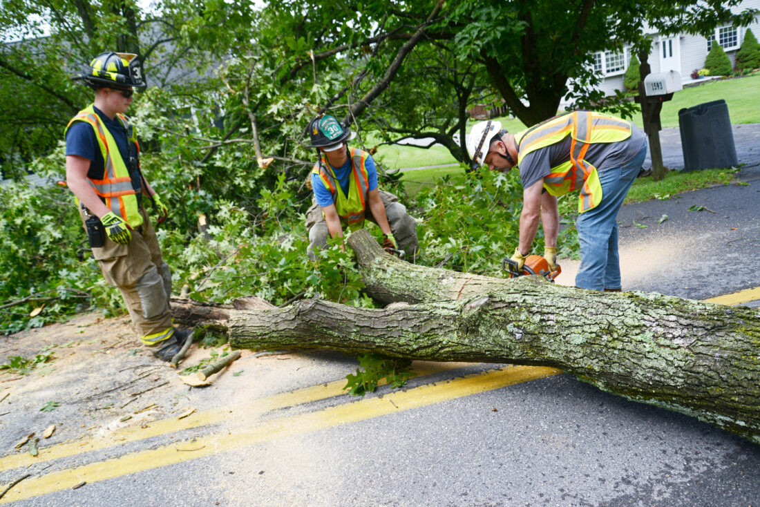 Mirror photo by Patrick Waksmunski Geeseytown Community Fire Company firefighter Ethan Carn, Lt. Robert Smith III and chief Dennis Estep (from left) remove a fallen tree across Sylvan Drive in Hollidaysburg on Monday morning.