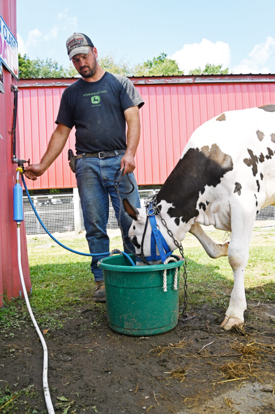 - Mirror photo by Patrick Waksmunski / Joe Strittmatter of Munster waters one of his son’s entries at the American Legion County Fair in Ebensburg on Wednesday afternoon.