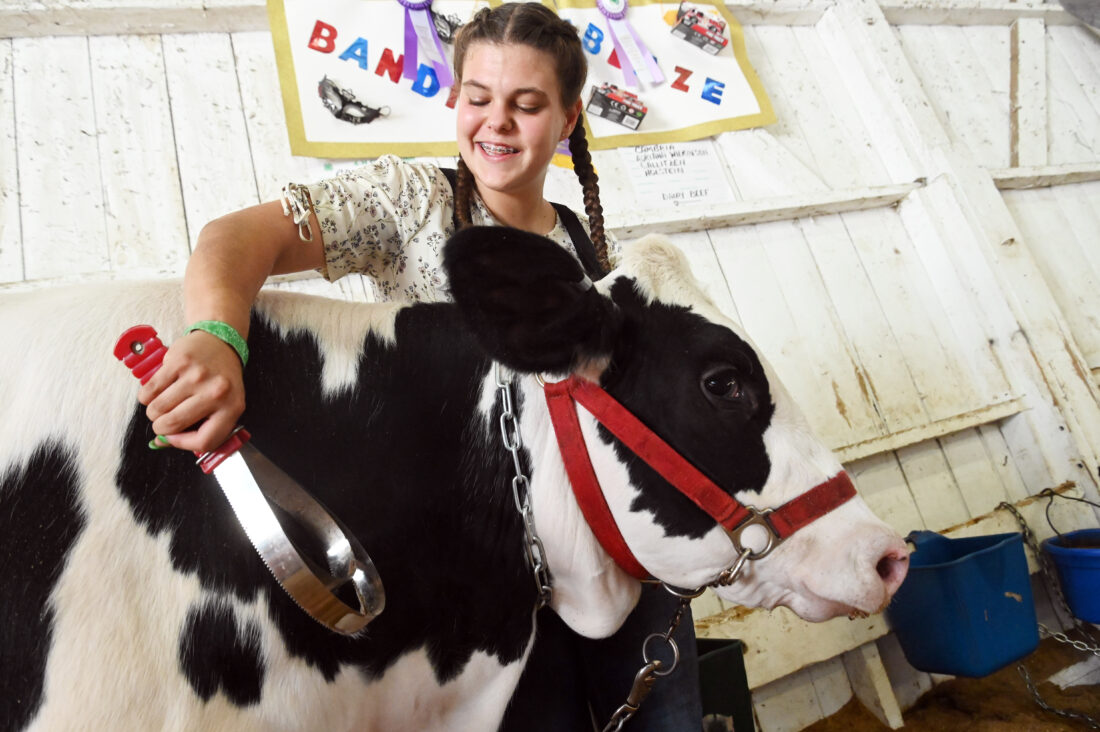 - Mirror photo by Patrick Waksmunski / Adrianna Wilkinson, 17, of Gallitzin grooms her American Legion County Fair Grand Champion 4-H Dairy Beef “Bandit” in the cattle barn on Wednesday afternoon.