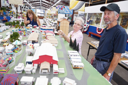 Mirror photo by Patrick Waksmunski / Mary Perez (center) of Ebensburg points out details of diorama of the American Legion County Fairgrounds in Ebensburg to Maria Berletic of Hollidaysburg and Joe Gailey of Gallitzin in the fair's exhibition hall on Wednesday afternoon. It took Perez a year to create the display.