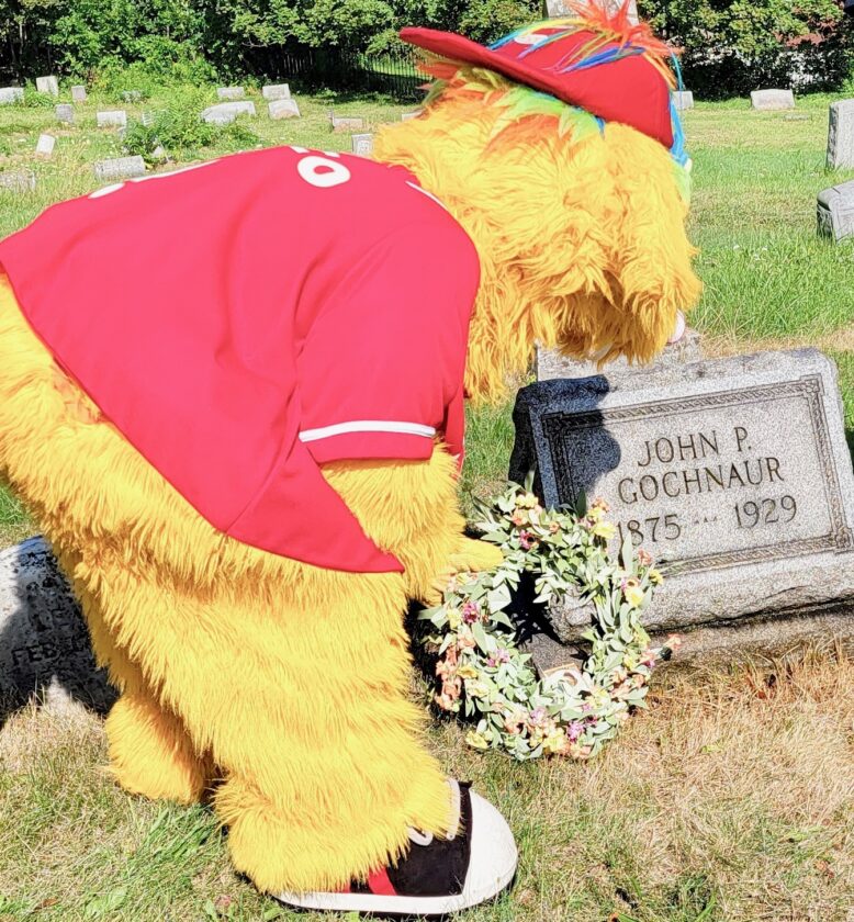 - Mirror photo by Cati Keith / Loco visits former Major League Baseball player John Gochnaur’s grave before the Altoona Curve gives away trading cards featuring Gochnaur at an upcoming game.