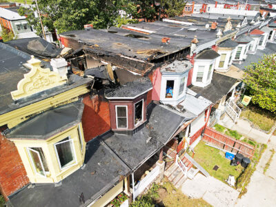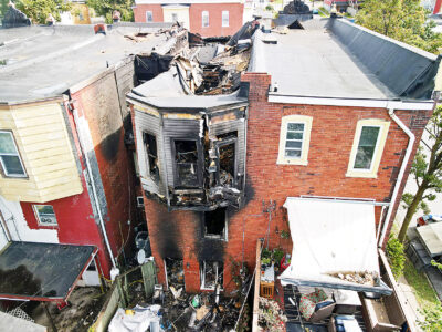 - An aerial view shows the rear of a rowhouse destroyed by fire early morning Thursday along the 3900 block of Fifth Avenue. Mirror photo by Patrick Waksmunski