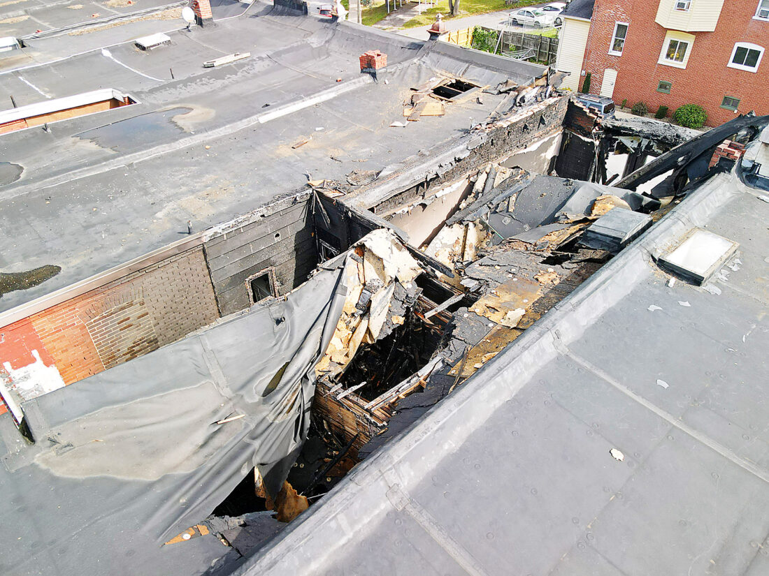 An overhead view shows damage from an early morning fire at an Altoona rowhouse along the 3900 block of Fifth Avenue. The fire caused the roof of the center of three houses to collapse onto the second floor. Mirror photo by Patrick Waksmunski