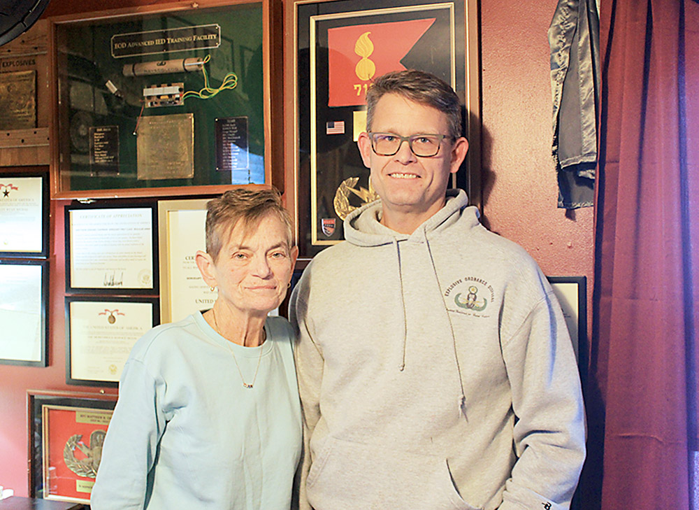 U.S. Army veteran Matthew Chapman and his wife, Debbi, stand together in front of Matthew’s military memorabilia, reflecting on their song lyrics in “The One They Call,” which will be released on Spotify Feb. 13. Mirror photo by Colette Costlow